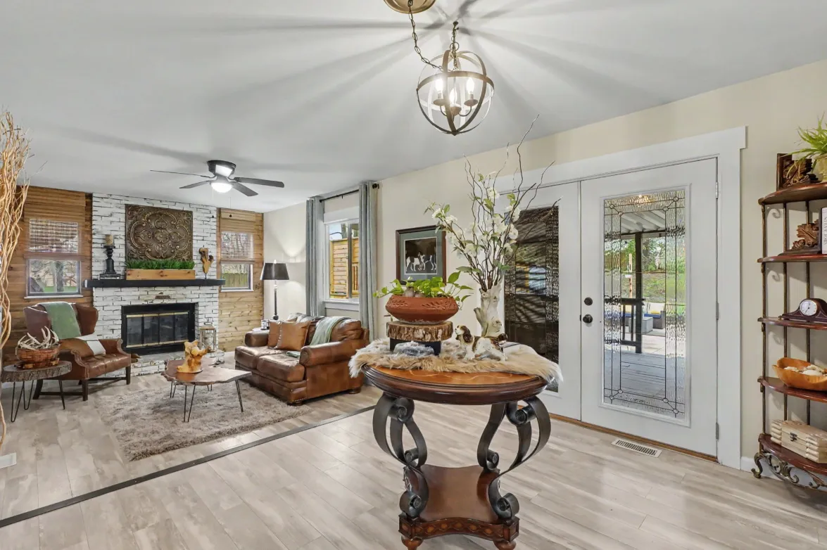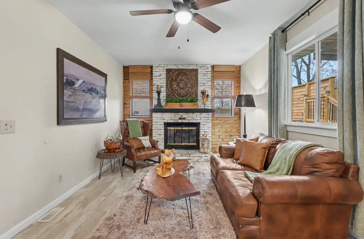 Inside, an open layout connects the living room, dining area, and kitchen, anchored by a cozy wood-burning fireplace. The finished lower level adds even more flexibility with a media room, rec space, two bedrooms, and a full bath perfect for guests or multi-use living.